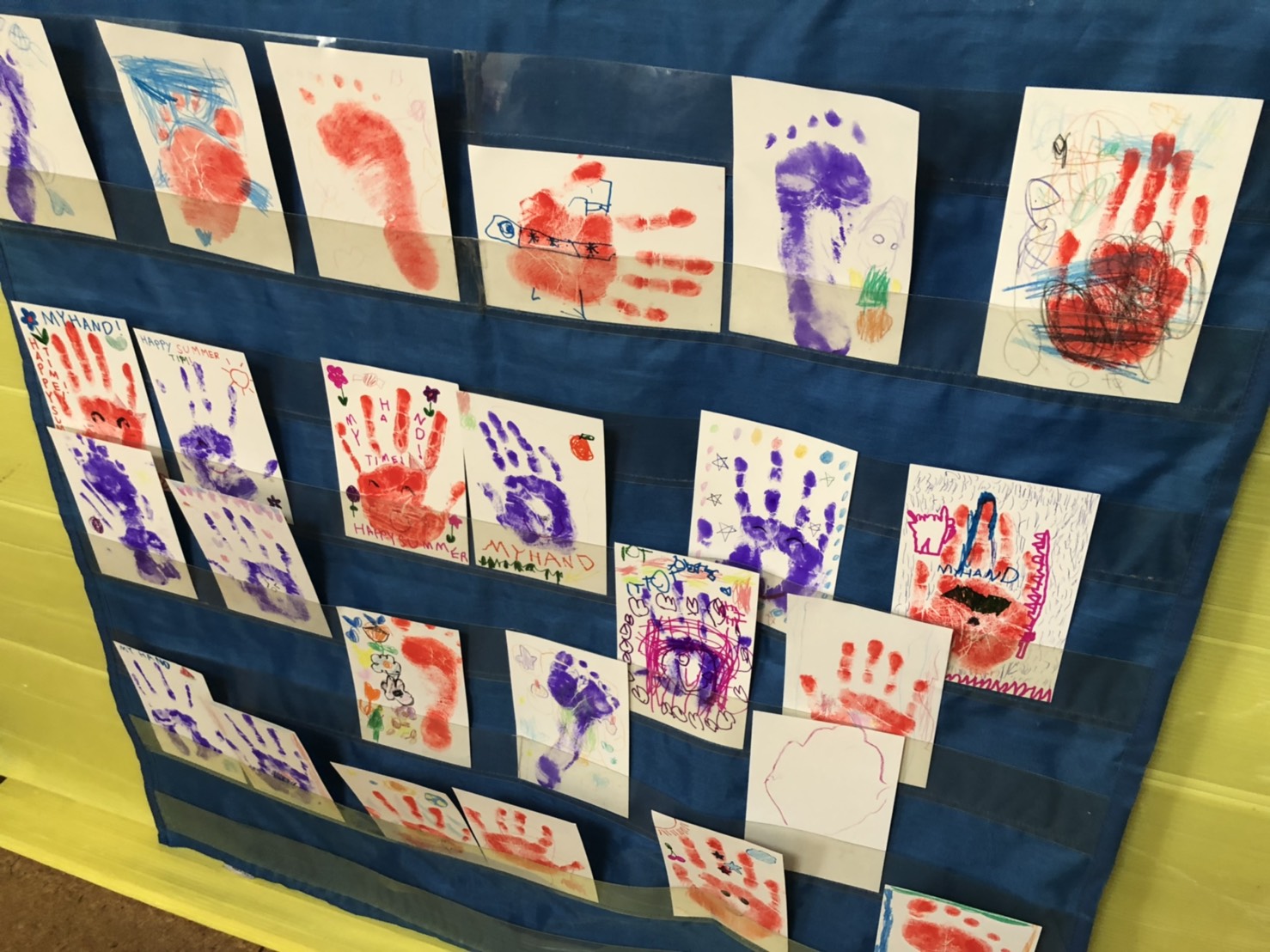 ポストカード作りのために一人づつ手足にインクをつけて、