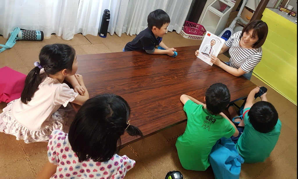 写真は、「国旗と国と挨拶を当てよう」のレッスン模様です。
