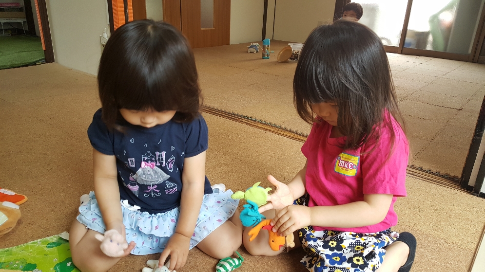 今日は遊びの時間に、動物の指人形を出してきて、歌いながら自分たちの指に指していたのがとてもかわいらしかったです。