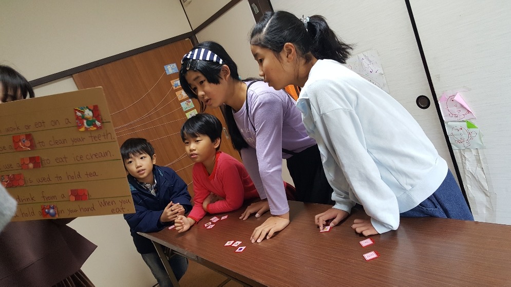 ゲームをする工程で、絵を見て自分たちの知ってる英単語や、英熟語、英文章を発言しあい文章を作ってから答えの英文章と合わせる。