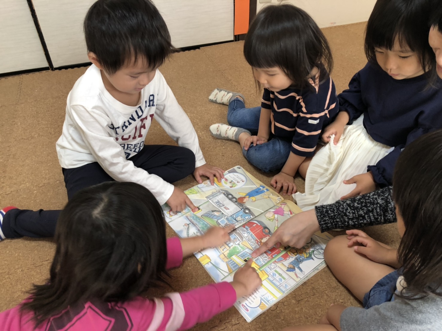 写真の様子は、フラッシュカードで単語リピートをした後、テキストブックで、同じモノを見つけてポイントしているところです(^^)