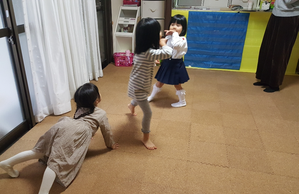 鳴き声を聞いて、自分たちがその動物になって真似っこをしているうちに、どんどん楽しくなってきて、いつの間にか、教室をクルクル駆け回っていました(笑)