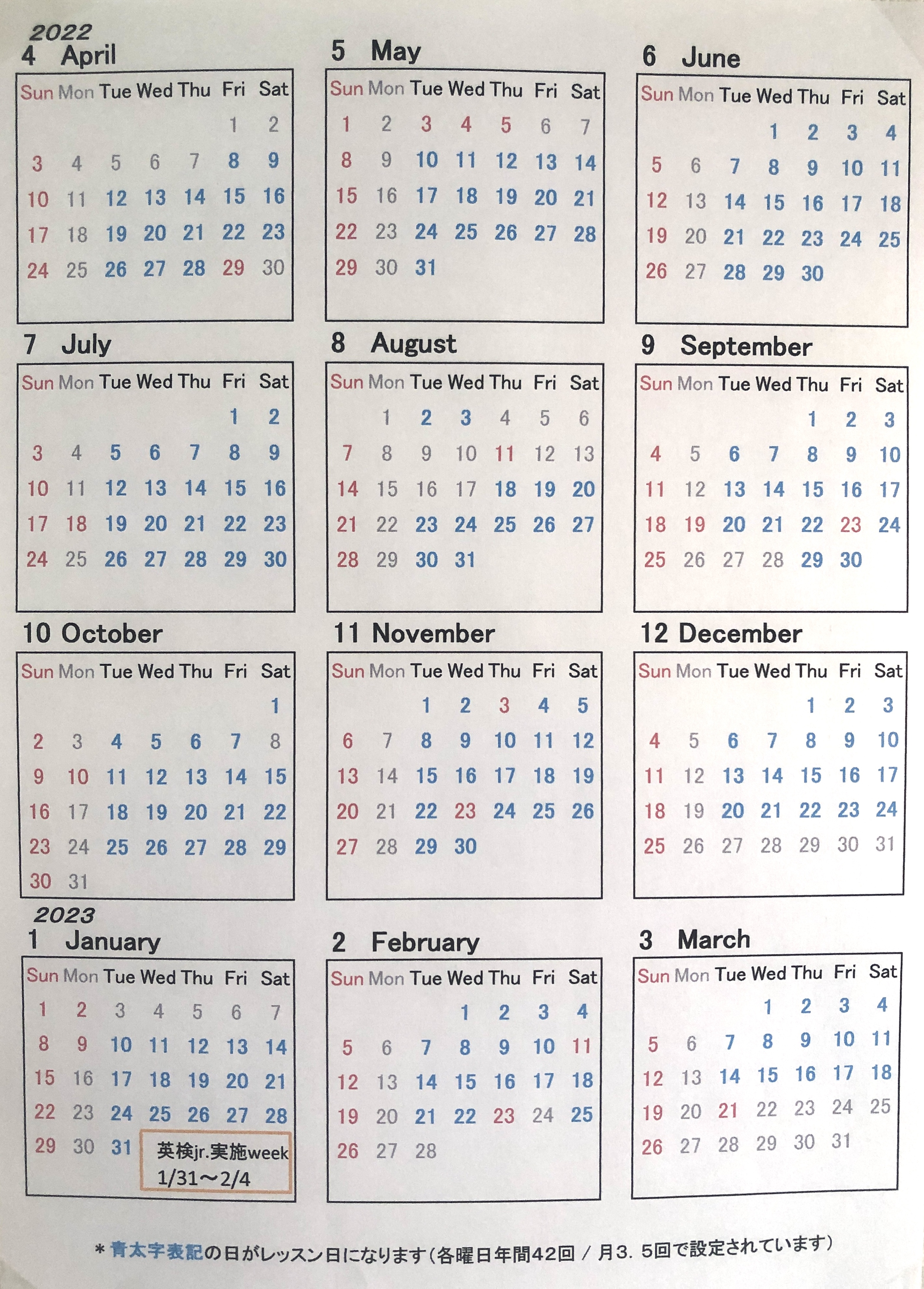 2022-04-07 2022年4月〜2023年3月末までのMKEレッスンカレンダーです❣️ 青字表記がレッスン開催日です❣️ どの曜日も年間42回のレッスン数になっています。 今期もみんな元気にレッスンにお越しください^_^ MKE Tweet