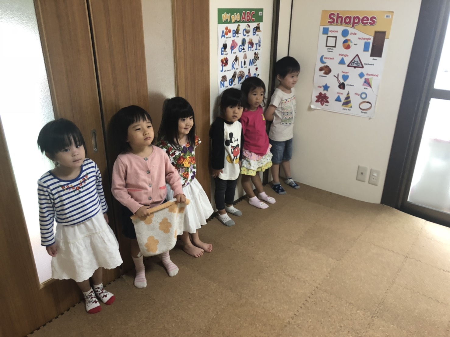 この一連の動きを一度見たならば、体験1回目さんも、なかなか慣れずに泣いていても、普段活動に積極的に参加できないシャイさんでも、どんなLPさんも、イントロが流れれば、ビューンと後ろに走っていって壁にペッタン! ピシッ!と、整列し、最後のハイタッチまでします。